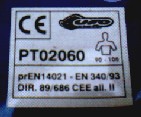 La marque CE figure sur une étiquette cousue sur l'équipement sur laquelle apparaît le numéro de la norme, un pictogramme représentant un motocycliste.